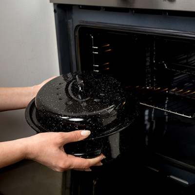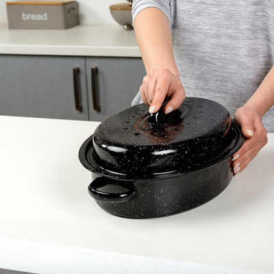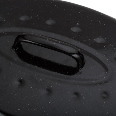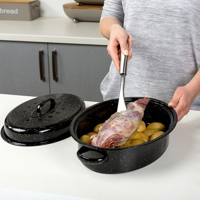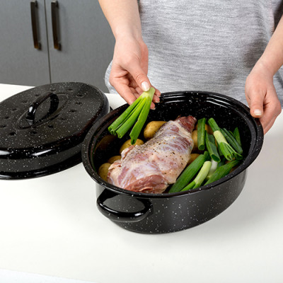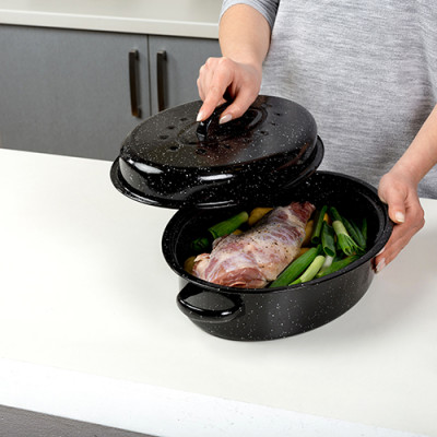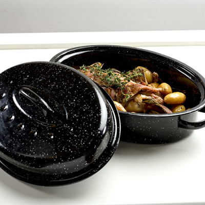 Γάστρα οβάλ εμαγιέ με καπάκι. Η εμαγιέ γάστρα είναι ένα ιδανικό σκεύος για μαγείρεμα στο φούρνο. Το εμαγιέ είναι ένα υλικό το οποίο θερμαίνεται γρήγορα και ψύχεται αργά διατηρώντας το μαγειρεμένο φαγητό ζεστό για περισσότερο χρόνο. Διανέμει ομοιόμορφα τη θερμότητα κατά το ψήσιμο. Έχει μεγάλη αντοχή στα γδαρσίματα, στις υψηλές θερμοκρασίες, είναι ελαφριά και εύκολη στο καθάρισμα. Κατάλληλη για πλυντήριο πιάτων.